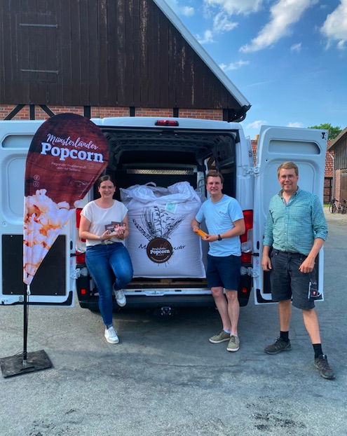 Der Popcornmais wird im Münsterland bei passenden Wetter- und Bodenbedingungen im April ausgesät. Da der Popcornmais über längere Zeit höhere Temperaturen benötigt, werden die Körner unter einer biologisch abbaubaren Folie aus Kartoffelstärke gegen Kälte geschützt. Die Ernte des Popcornmais erfolgt im Herbst. Dabei werden die Maiskolben mit einer Kolbenpflückmaschine gepflückt und von der Restpflanze befreit. Nach der Zwischenlagerung in einem Bunker wird der Mais auf einem Trocknungswagen getrocknet, bevor er gelagert und weiterverarbeitet werden kann.